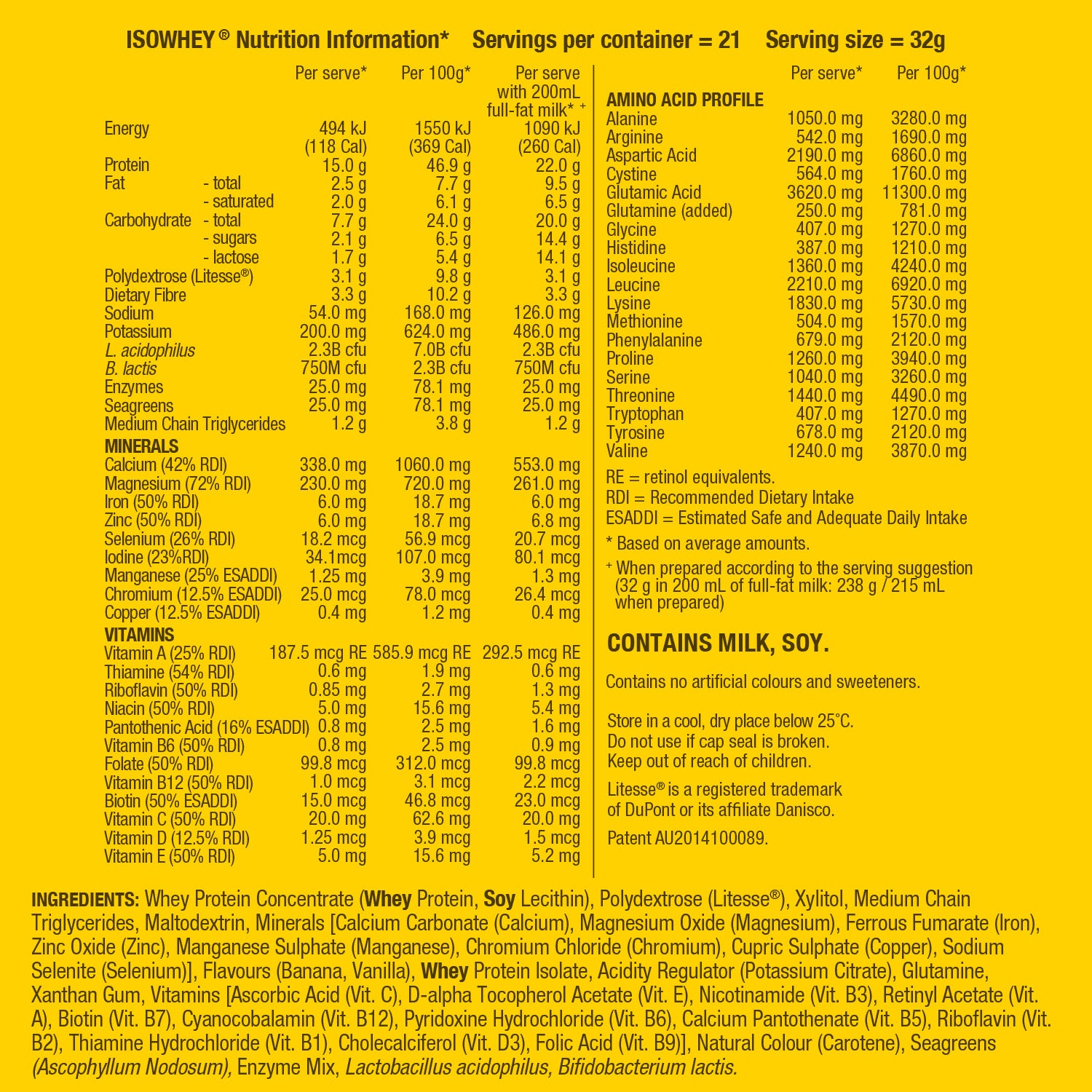 - Gluten-free and less than 1g of lactose per serve.