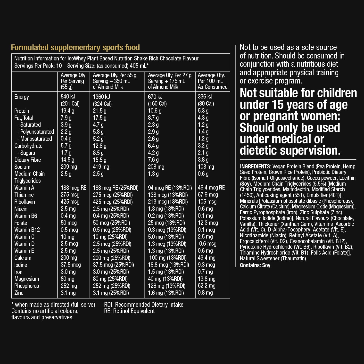 Vegan Protein Blend [Pea Protein, Hemp Seed Protein, Brown Rice Protein], Prebiotic Dietary Fibre (Isomalto-Oligosaccharide), Lecithin (Soy), Medium Chain Triglycerides (7%), Mineral Mix [Potassium Phosphate Dibasic (Potassium, Phosphorus), Calcium Citrate (Calcium), Magnesium Oxide (Magnesium), Ferric Pyrophosphate (Iron), Zinc Sulphate (Zinc), Potassium Iodide (Iodine)], Natural Flavours [Vanilla, Caramel], Xanthan Gum, Vitamin Mix [Ascorbic Acid (Vit. C), Tocopheryl Acetate (Vit. E), Nicotinamide (Vit. B3), Retinyl Acetate (Vit. A), Ergocalciferol (Vit. D2), Cyanocobalamin (Vit. B12), Pyridoxine Hydrochloride (Vit. B6), Riboflavin (Vit. B2), Folic Acid (Vit. B9)], Natural Sweetener (Thaumatin).