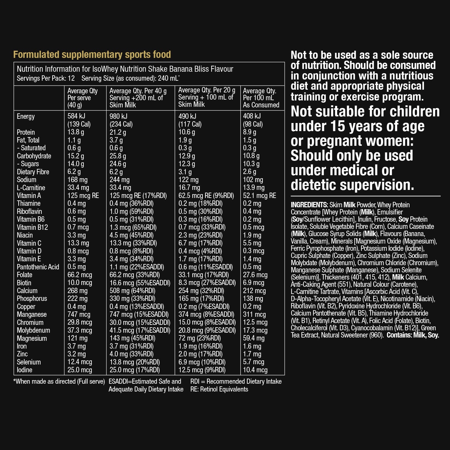 Powder, Soy Protein Isolate, Soluble Vegetable Fibre (Corn), Calcium Caseinate, Glucose Syrup Solids, Thickeners (401, 415, 412), Minerals [Magnesium Oxide (Magnesium), Ferric Pyrophosphate (Iron), Potassium Iodide (Iodine), Copper Sulphate Pentahydrate (Copper), Zinc Sulphate (Zinc), Sodium Molybdate (Molybdenum), Chromium Chloride (Chromium), Manganese Sulphate (Manganese), Sodium Selenite (Selenium)], Flavours (Banana, Vanilla), Milk Calcium, Anti-Caking Agent (551), Vitamins [Ascorbic Acid (Vit. C), D Alpha Tocopherol Acetate (Vit. E), Nicotinamide (Vit. B3), Riboflavin (Vit. B2), Pyridoxine Hydrochloride (Vit. B6), Calcium Pantothenate (Vit. B5), Thiamine Hydrochloride (Vit. B1), Retinyl Acetate (Vit. A), Folic Acid (Vit. B9), Biotin, Cholecalciferol (Vit. D3), Cyanocobalamin (Vit. B12)], L-Carnitine, Natural Sweetener (960), Green Tea Extract.