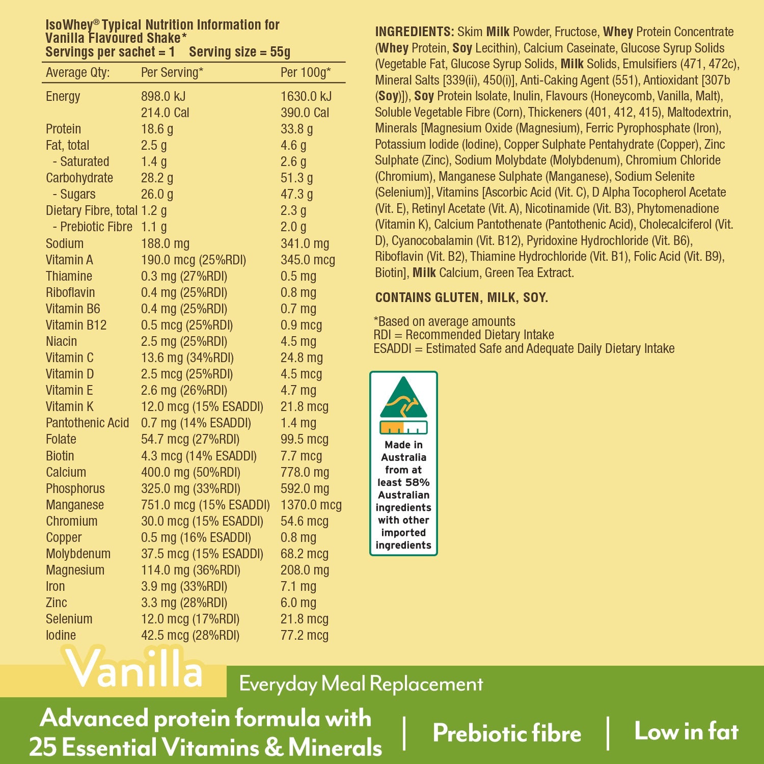 The sachets are conveniently mixed with water so they can be made whenever you need a healthy meal or snack. Perfect for keeping in your bag, desk or car IsoWhey everyday meal replacement is deliciously rich and creamy with a sweet vanilla flavour.