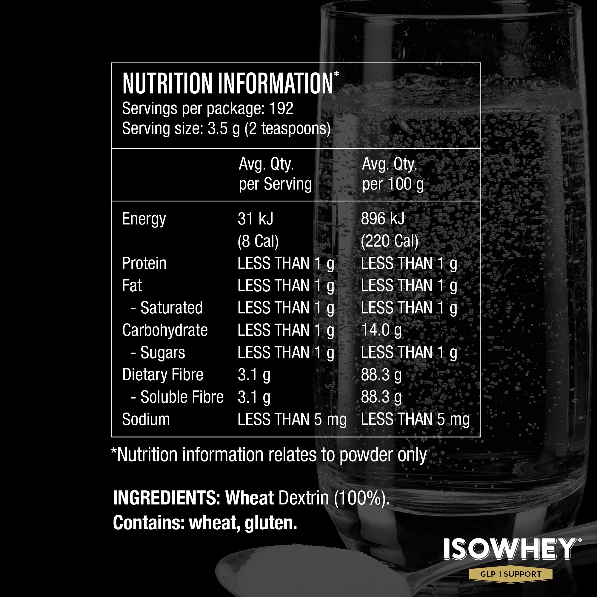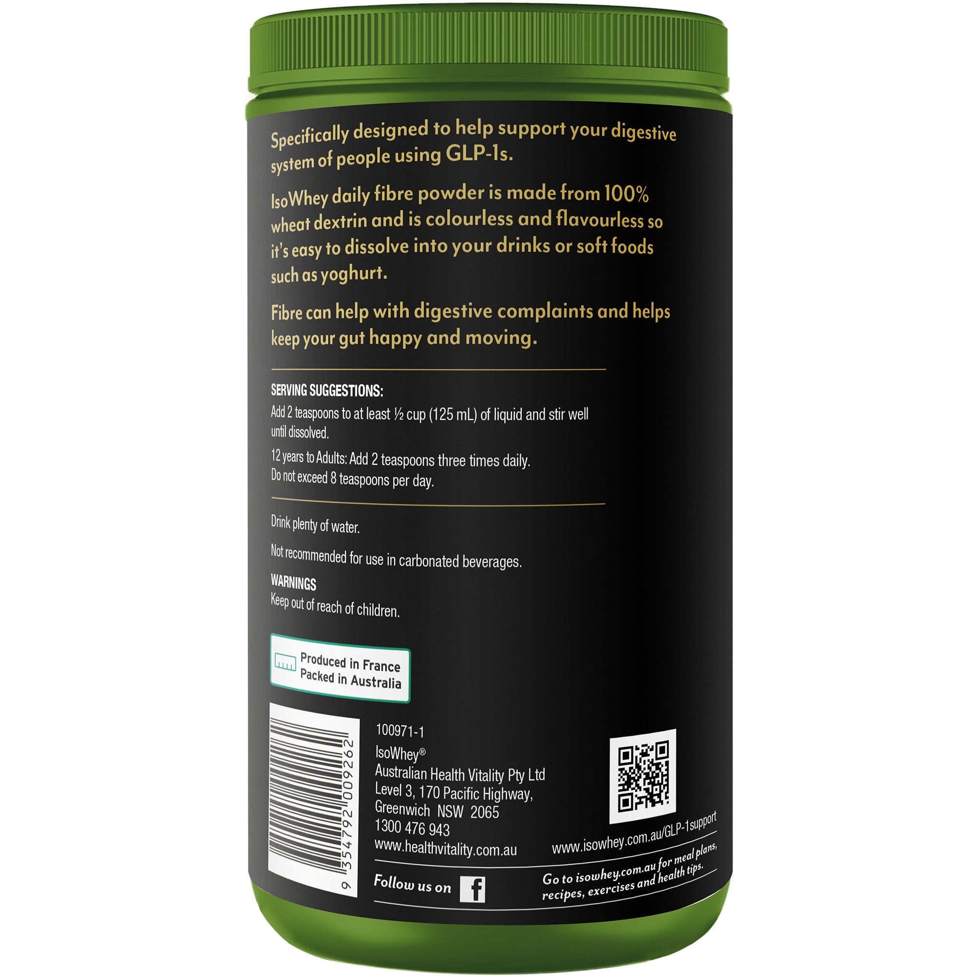 IsoWhey GLP-1 Support daily fibre powder is made from 100% wheat dextrin and is colourless and flavourless so it's easy to dissolve into your drinks or soft foods such as yoghurt.