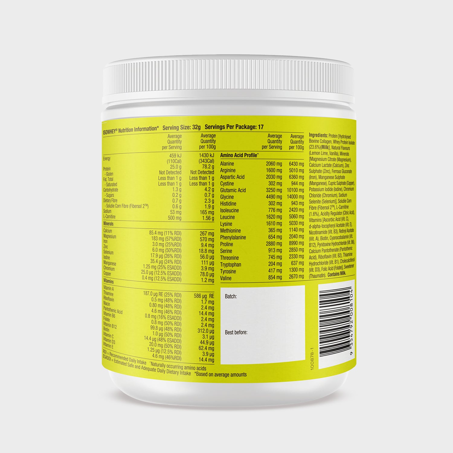IsoWhey Clear Lemon Lime Shake contains a unique blend of clear whey protein, collagen, essential vitamins, minerals, and amino acids to help you reach your weight goals when used in conjunction with a healthy, calorie-controlled diet and regular exercise. Enjoy the light, refreshing taste of lemon lime, without the milky taste, while benefiting from the advanced IsoWhey Clear formula: