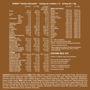 Whey protein concentrate (whey protein, soy lecithin), Litesse® (polydextrose), xylitol, coffee flavour, coffee powder, medium chain triglycerides, calcium carbonate (calcium), vanilla flavour, whey protein isolate, magnesium oxide heavy (magnesium), potassium citrate (potassium), glutamine, xanthan gum, seagreens (Ascophyllum nodosum seaweed), enzyme mix, ascorbic acid (vitamin C), ferrous fumarate (iron), Lactobacillus acidophilus, stevia extract powder, chromium picolinate (chromium), zinc oxide (zinc), d-alpha tocopheryl succinate (vitamin E), nicotinamide (vitamin B3), potassium iodide (iodine), manganese sulfate monohydrate (manganese), vitamin A acetate (vitamin A), Bifidobacterium lactis, biotin, cupric sulfate pentahydrate (copper), sweetener (thaumatin), folic acid (vitamin B9), selenomethionine (selenium), pyridoxine hydrochloride (vitamin B6), calcium d-pantothenate (vitamin B5) riboflavin (vitamin B2), thiamine hydrochloride (vitamin B1), cholecalciferol (vitamin D3), cyanocobalamin (vitamin B12), sodium. Contains milk and soy.